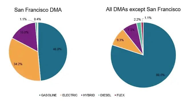 Selon une nouvelle étude de S&P Global, la raison principale qui peut expliquer le succès des véhicules électriques à San Francisco est la composition démographique de la ville. Pour le dire plus simplement, les habitants de la baie de San Francisco sont en moyenne plus jeunes que ceux des autres régions (38,6 % des acheteurs de San Francisco ont entre 18 et 34 ans, contre 32,7 % dans les autres régions) et ont également tendance à être plus aisés.