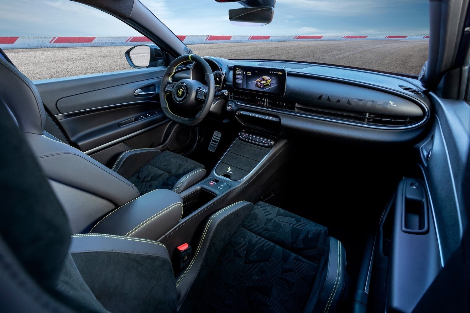 A l’intérieur, on trouve des sièges avant inédits, plus enveloppants. Ils sont habillés de cuir et d’Alcantara, avec des surpiqûres jaune fluo, la nouvelle couleur signature d’Abarth. On retrouve ces éléments sur le volant, qui se dote d’un repère central, lui aussi jaune fluo.