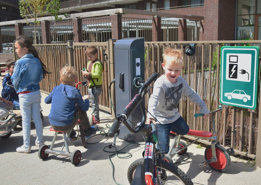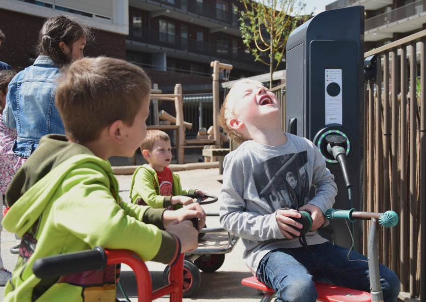 Pour sensibiliser les enfants à la mobilité électrique, le fabricant de bornes de recharge hollandais EVBox a équipé deux écoles Montessori à Amsterdam. Spécialement modifiées pour leur visée pédagogique, elles sont installées dans les cours de récréation.