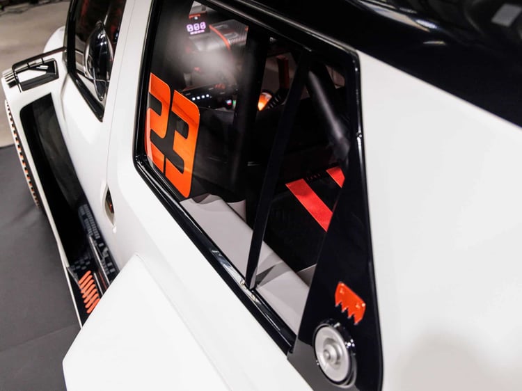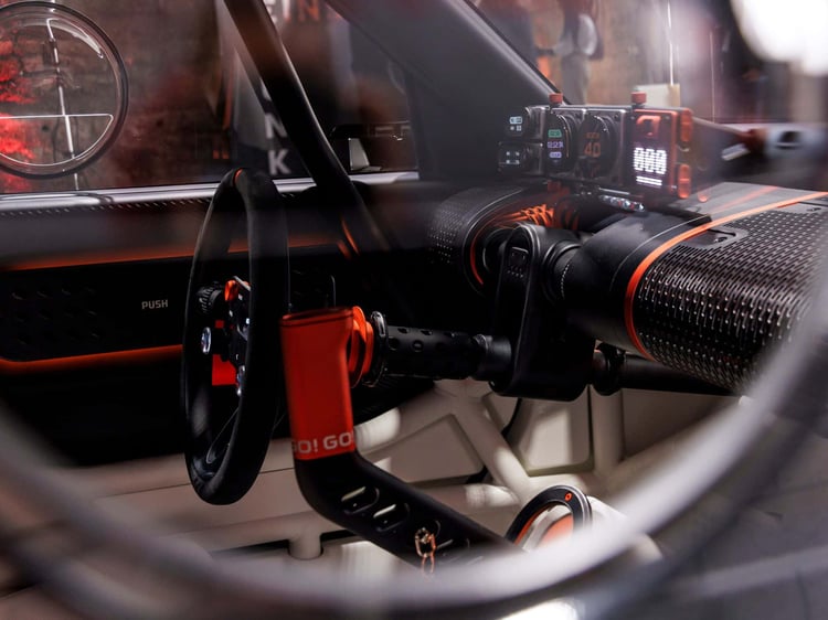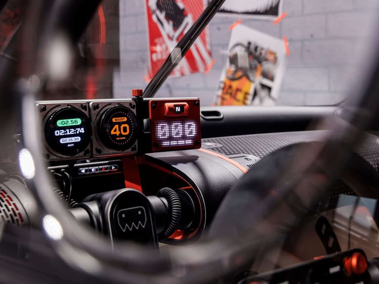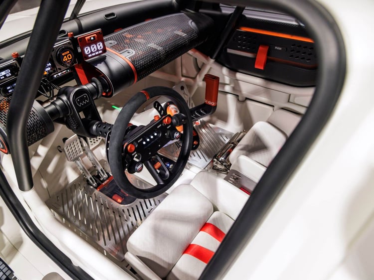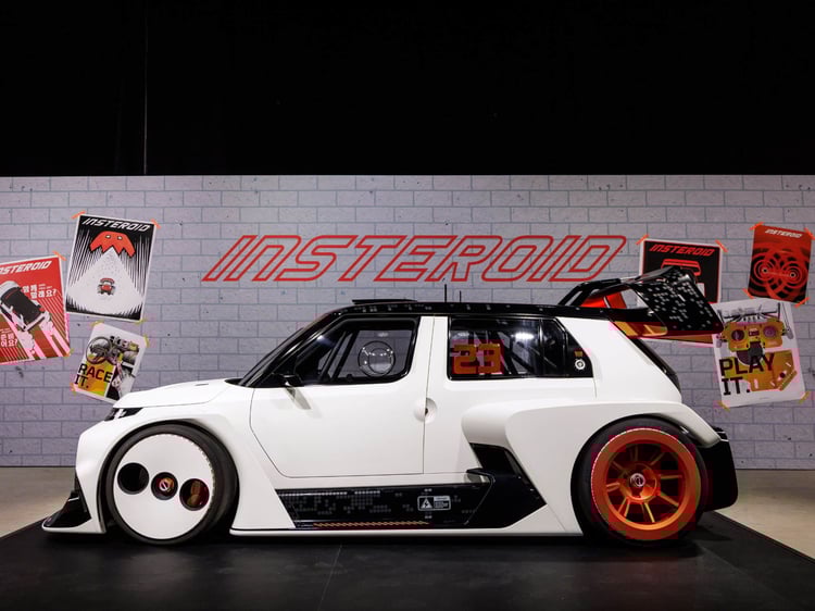 L’intérieur de l’Insteroid est aussi impressionnant que dépouillé. On y découvre un arceau-cage, deux sièges baquets, un volant sport au revêtement antidérapant, un frein à main hydraulique et une rangée d’écrans carrés servant à afficher un tas d’informations avec des animations graphiques. C’est stylé, ça a de la gueule mais, tout comme pour le reste du concept, ça « ne sert à rien ». C’est une jolie maquette bien détaillée, avec des éléments crédibles installés.