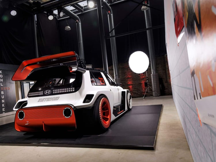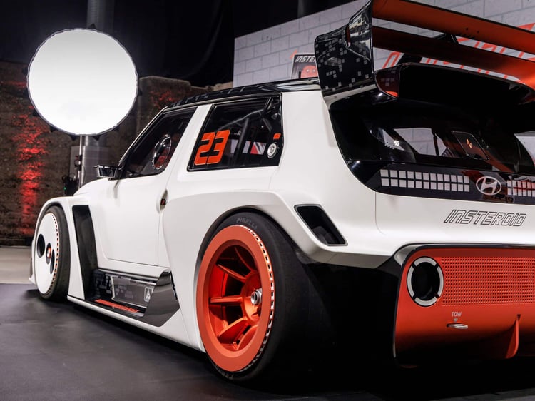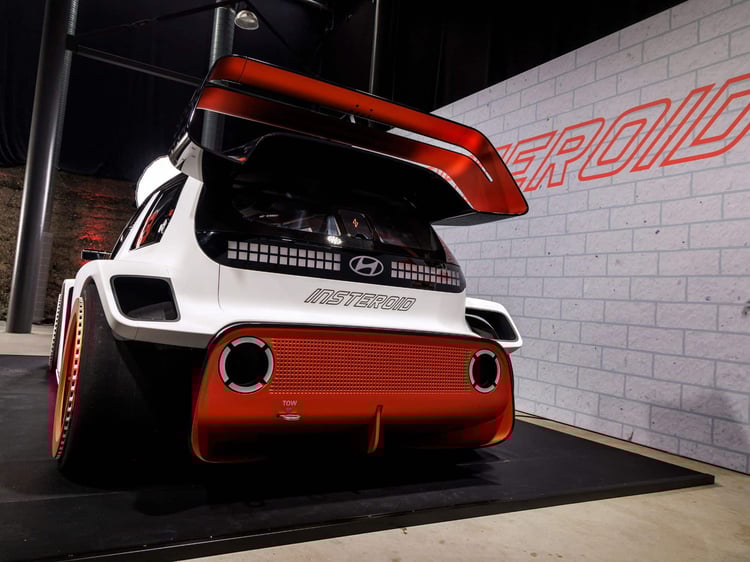 Mis à part la partie de la face avant intégrant les feux et le logo Hyundai, chaque millimètre carré de l’Insteroid a été radicalement retravaillé. À l’avant, le pare-choc est ultra-massif, tout comme la lame qui le contourne. Il y a des prises d’air et même un semblant de radiateur apparent typique des voitures (thermiques) de rallye. L’ensemble est assez agressif et cohérent, malgré une garde au sol inéxistante. Rappelons qu’il s’agit d’une maquette esthétique qui ne tient compte d’aucune contrainte physique. Une voiture de jeu vidéo mais sans… jeu vidéo.