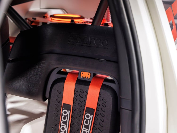 De profil, l’Insteroid est tout aussi impressionnant, avec notamment ses énormes jantes dépareillées et ses hanches bien laaaaaaaarge (avec exactement 8 « a »). Là encore, tout est fake et il n’y a aucune prétention aérodynamique ou autre. Le mot d’ordre est le fun, et ça l’est. On continue notre tour du propriétaire et on s’arrête au niveau de l’arrière, où se trouve cet énorme aileron. Quelques flashbacks de Pikes Peak, de courses de Gran Turismo en Suzuki Escudo… On sent que les ingénieurs à l’origine de ce projet sont de véritables passionnés, et je suis certain que nous avons passé beaucoup (trop) d’heures à jouer aux mêmes jeux vidéo. En plus de cet énorme spoiler et du diffuseur qui n’a aucun sens, l’lnsteroid intègre une sorte de panneau lumineux dans le pare-chocs arrière, où les pixels s’allument et peuvent jouer des animations bien sympathiques selon le programme choisi.