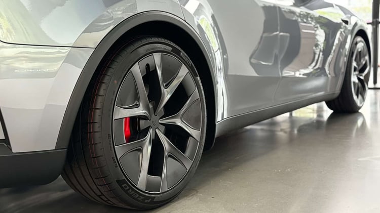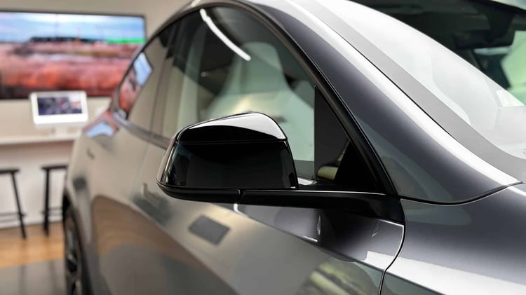 Essai – Tesla Model Y Propulsion 2025 : chameau de compétition avec bonusAvant de monter à bord de notre SUV sportif, on remarque l’apparition du logo Performance projeté au sol depuis les rétroviseurs. Un élément de design devenu incontournable en 2025.