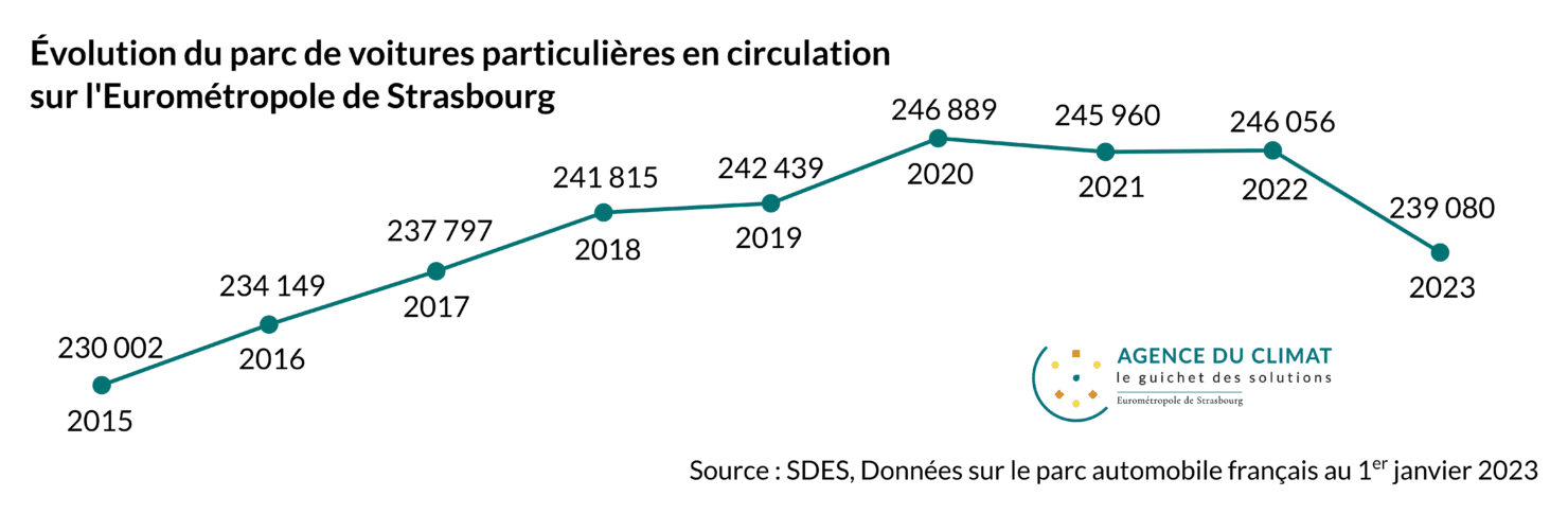 Entre le 1ᵉʳ janvier 2022 et le 1ᵉʳ janvier 2023, le parc de voitures particulières en circulation à Strasbourg a diminué de 2,83 %, passant de 246 056 à 239 080 unités. La baisse de la circulation est visible à l’échelle nationale, mais c’est dans la métropole alsacienne qu’elle est la plus prononcée. La hausse du parc avait été continue jusqu’à 2020. Puis le nombre s’était stabilisé, avant de chuter en 2023.