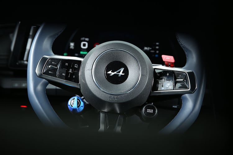 Fort de ces niveaux de puissance, l’Alpine A390 fait des dépassements une simple formalité. Dans ce cas, trois choix s’offrent au conducteur : appuyer normalement sur la pédale et convoquer la puissance maximale, appuyer à fond au-delà du cran, ce qui activera la fonction Overboost et le pic de plus de 300 kW, ou laisser le pied à sa place tout en appuyant sur la touche OV du volant, ce qui libérera les plus de 300 kW. À noter que l’Overboost est disponible pendant 12 s et se recharge en 10 s.