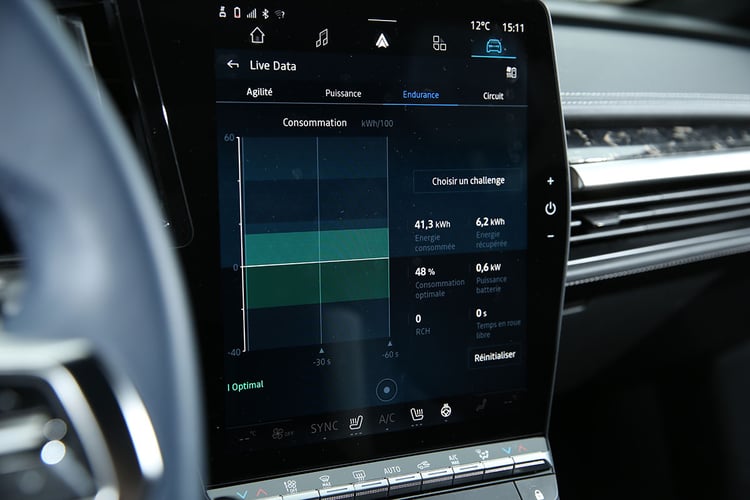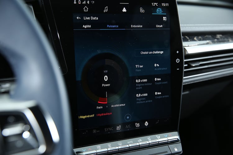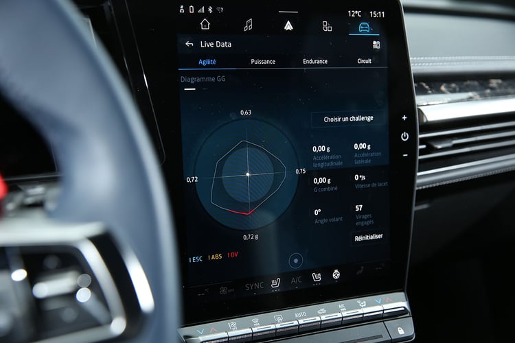 Essai Alpine A390 : Super Renault Scenic ou vraie Berlinette électrique ?D’habitude, les voitures électriques sont particulièrement avares en informations communiquées au conducteur. Les constructeurs sont d’un commun accord pour affirmer que des informations comme la température de la batterie « ne sont pas pertinentes pour les conducteurs ». Pour souligner son caractère sportif, l’Alpine A390 n’est pas de cet avis et propose un impressionnant menu Live Data, capable de faire rougir de plaisir les amoureux des chiffres.