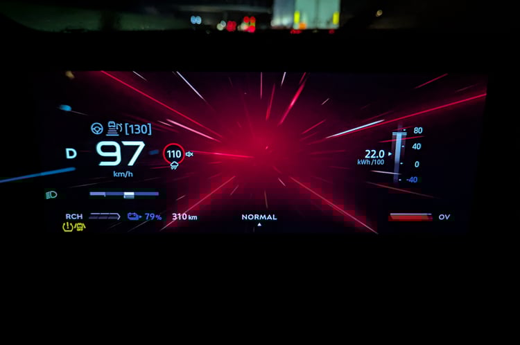 Commençons par écarter le dernier cas de figure, qui n’apporte rien. On a mesuré moins de 0,1 s dans le meilleur des cas en appuyant sur la touche, ce qui peut se situer dans la marge d’erreur. En appuyant sur l’accélérateur avant le premier cran, la puissance de sortie batterie est proche des 250 kW, pour un peu plus de 235 kW aux trois machines. On enregistre un 80-120 km/h à 80 % de charge en 3,3 s dans ce cas-là. En soudant la pédale au plancher, la batterie débite près de 320 kW, soit à peine moins de 310 kW aux blocs électriques. Ici, le chrono passe à 3,1 s.