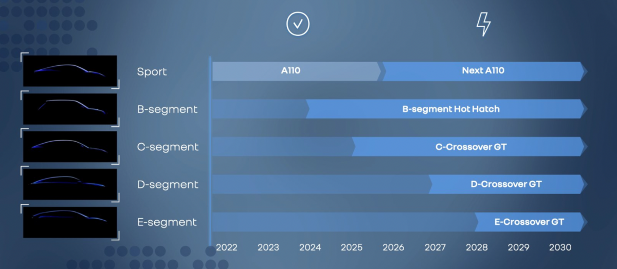 Début 2021, lors de la présentation du plan « Renaulution », Luca de Meo a annoncé qu’Alpine va rapidement devenir une marque 100 % électrique. Trois modèles sont prévus.