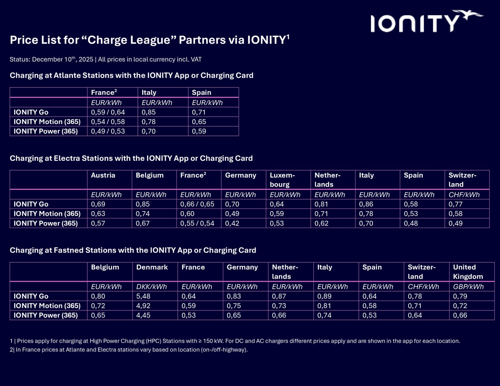 Si vous êtes client Ionity, il faudra compter entre 0,64 €/kWh et 0,49 €/kWh pour se charger chez Atlante en France en fonction de votre forfait. Entre 0,66 €/kWh et 0,54 €/kWh chez Electra. Et entre 0,64 €/kWh et 0,53 €/kWh chez Fastned.