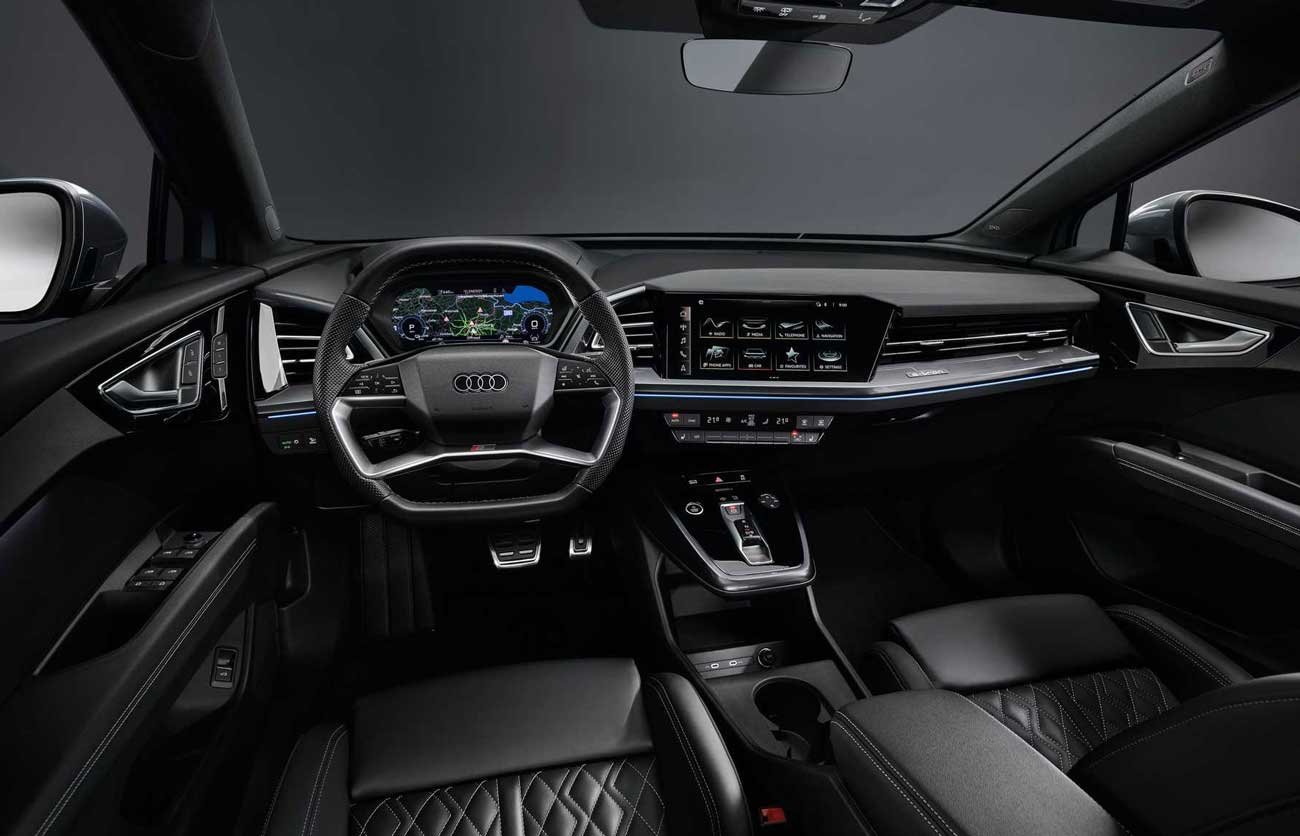 L’habitacle de l’Audi Q4 e-tron renferme des joyaux de luxe et d’innovation. En option, le système audio premium SONOS offre une qualité sonore exceptionnelle à travers ses dix haut-parleurs haute performance. Sur les branches du volant, des surfaces tactiles permettent de naviguer facilement entre les fonctions par un simple glissement de doigt, sans perdre de vue la route. Côté rangements, le coffre spacieux de 520 litres (1490 litres avec les sièges arrière rabattus) offre une généreuse capacité de chargement.