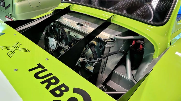 Pour notre bébé, vous le connaissez déjà si vous avez suivi notre série sur sa conception et/ou si vous avez arpenté les allées du dernier Rétromobile début février où il a fait sa première apparition publique. L’esprit de cette version break Combi de 1968 de la première génération de la Skoda Octavia, prend un contre-pied total du parti pris de Turbo, avec comme ligne directrice l’efficience et la polyvalence. Pas question donc de sacrifier le moindre centimètre-cube de volume de chargement ni le moindre passager (c’est illégal de toute façon), ce qui a dicté de nombreux choix mécaniques orchestés par Rétrofuture. Le premier a été de couper en deux un pack de batteries constitué quatre modules d’Enyaq, avec une moitié se logeant, avec l’électronique de puissance, en lieu et place de la roue de secours et du réservoir d’essence, et l’autre sous le capot, au-dessus du moteur accolé à la transmission d’origine. L’habitabilité a donc été conservée et la puissance similaire à celle d’origine ainsi qu’une masse plus élevée de seulement 140 kg a permis de garder suspensions et freins d’origine, quoique refait à neuf.