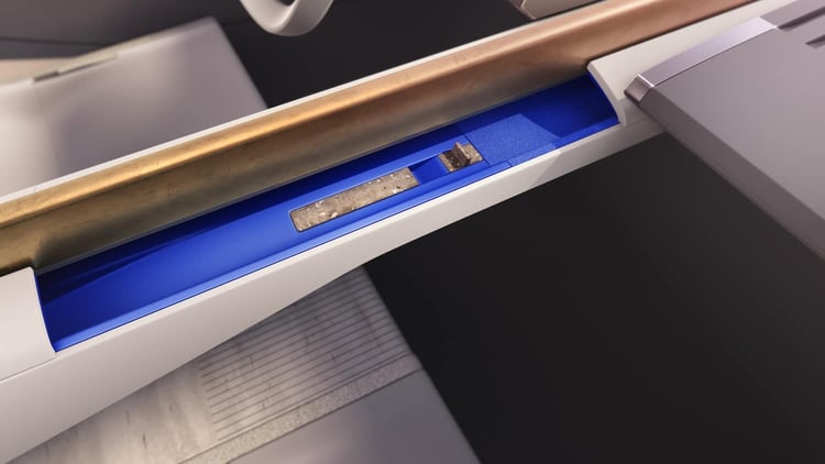 Comme l’extérieur, l’intérieur se veut à la fois épuré et exubérant. Une colonne vertébrale sépare le conducteur et le passager. Elle est habillée de laiton, matière que l’on retrouve en haut des portes. Quand ils ne sont pas utiles, les deux grands écrans sont cachés dans la planche de bord.