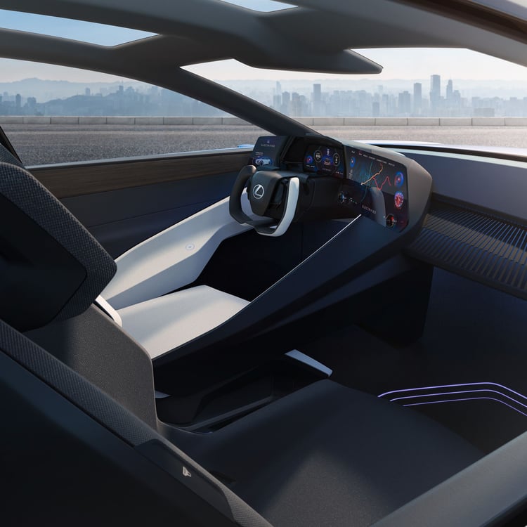 Au contraire, petite déception pour l’intérieur dépouillé, plus sport que luxe avec ses sièges baquets. L’atmosphère, que Lexus baptise « Tazuna », hérite d’un volant yoke façon Tesla Model S 2021. La planche de bord est vide, laissant 3 écrans devant le conducteur, ainsi qu’un sélecteur de vitesse. Le constructeur apporte également une interface vocale basée sur l’IA, et une fonction antibruit.