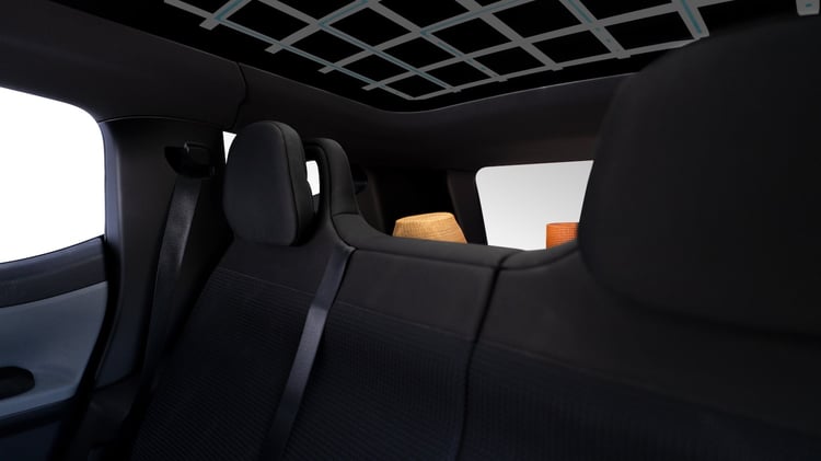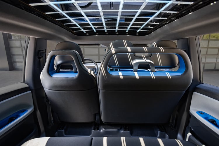 De base, le modèle a cinq places, mais il peut y en avoir six. Le siège passager est remplacé par une banquette deux places. La banquette arrière se replie en formant un plancher plat, ce qui permet de former un espace « lounge » pour se reposer. Le constructeur indique que l’habitacle est conçu de manière durable, sans pièces mobiles fragiles, avec des matériaux recyclés. Il y aura en option un écran rotatif de 17,1 pouces. Le Pear sera le première modèle doté de l’ordinateur conçu en interne, le Fisker Blade.