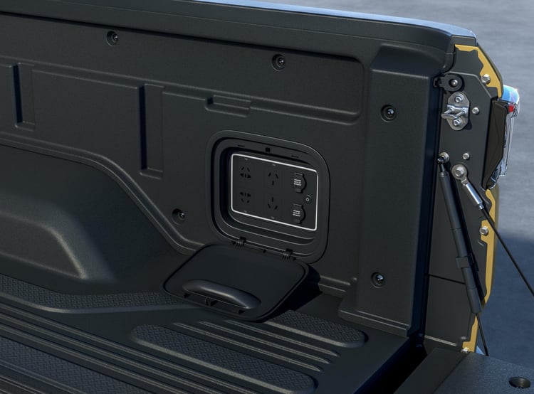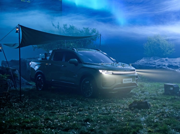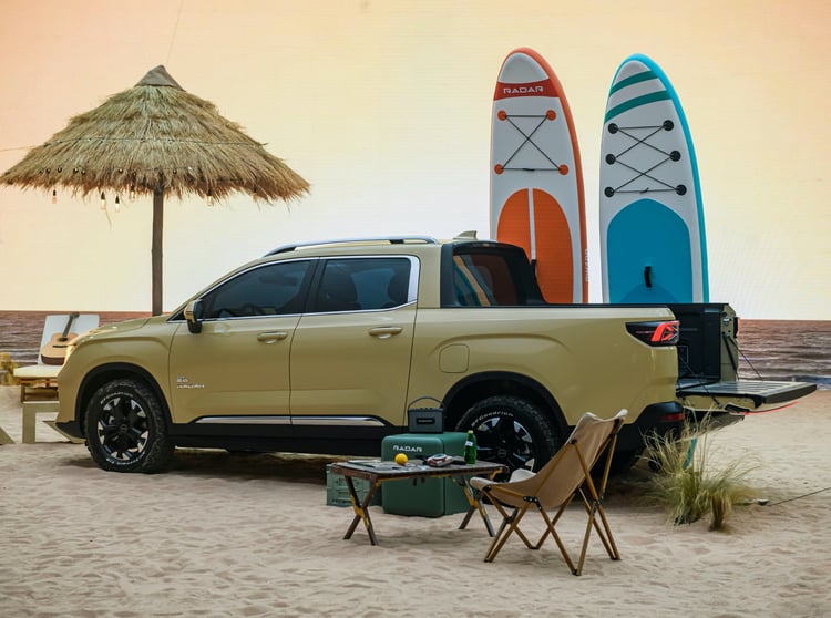 Le Radar RD6 n’est donc pas un pick-up « de travail » et s’apparente plus à un SUV doté d’une benne arrière. Cap sur le surf, le vélo, le camping… L’intérieur reste masqué et Geely ne nous montre que l’extérieur, et la benne équipée de prises de courant. Le style extérieur reste très classique par rapport à l’offre de SUV en Chine. Bien entendu, il est très différent des autres pick-up chinois puisqu’il est le premier en son genre, mais sans doute pas le dernier. Ce sont surtout ses proportions qui peuvent étonner. Tirant parti de sa propulsion électrique, il affiche un capot assez court par rapport aux habitudes sur ce type de véhicule. La benne semble en revanche plutôt longue.