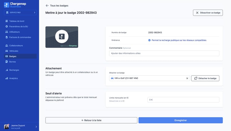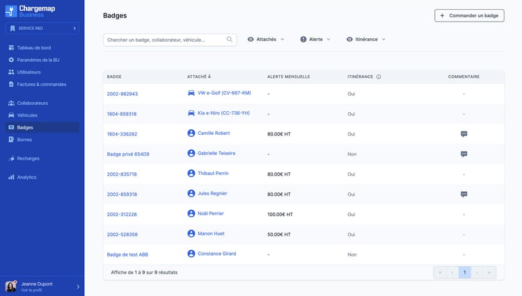 Basée sur l’ADN de Chargemap, celle-ci se caractérise par une nouvelle plateforme dédiée. Directement pilotée par le gestionnaire de flotte, l’interface permet de gérer en ligne la commande des badges, mais aussi de les assigner à des utilisateurs ou à des véhicules spécifiques, le tout avec une seule facture globale.