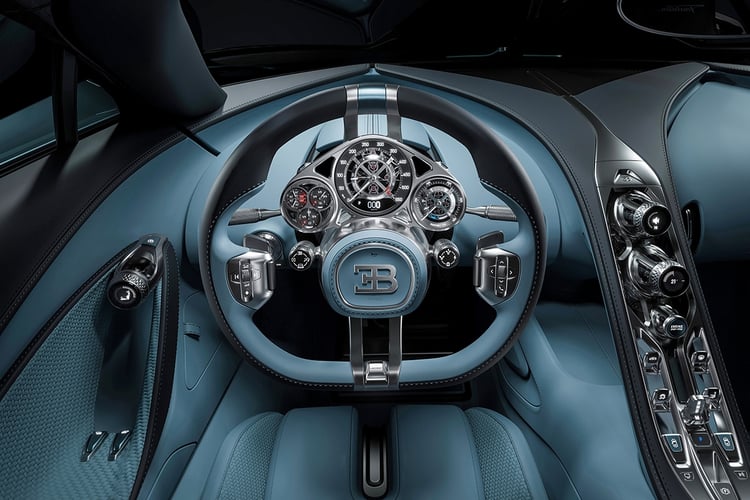 Imaginée comme un voiture radicale, la Bugatti Tourbillon annonce un poids de 1 995 kg. Et ce grâce aux solutions techniques retenues, dont le châssis monocoque en carbone où la batterie participe à la rigidité structurelle. Les sièges sont fixés à la coque, et seuls le pédalier et le volant sont réglables pour parfaire la position de conduite. A noter que ce dernier dispose d’un moyeu fixe, à l’instar de ce que l’on retrouvait à bord des Citroën C4… ou de la Maserati Boomerang, un exemple plus parlant pour les passionnés d’aiguilles. Car à ce sujet, la Tourbillon porte bien son nom : référence au mécanisme éponyme en horlogerie et composée de 600 pièces réalisées en rubis, saphir et titane, l’instrumentation est fabriquée par des horlogers suisses.