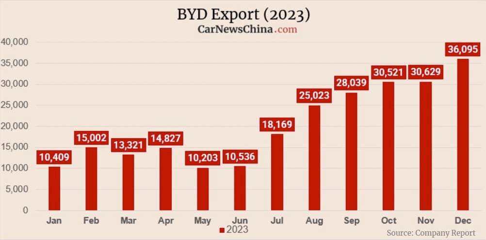 Les modèles hybrides rechargeables ont eux aussi connu une belle croissance. 1 438 084 unités se sont écoulées, ce qui représente une augmentation de 52 % par rapport à 2022. Il est également intéressant de regarder les chiffres des exportations. BYD a vendu 242 766 véhicules hors de Chine en 2023. Ce qui fait une augmentation spectaculaire de 334 % d’une année sur l’autre.