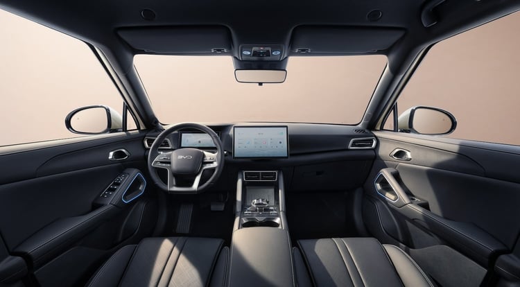 La planche de bord est simple : un très grand écran central, qui rejette les aérateurs en bas, et un écran pour l’instrumentation. BYD dit avoir soigné la présentation avec « des surfaces matelassées dans toutes les zones clés » ou des poignées bien intégrées aux portes. Le sélecteur de conduite sur la console centrale prend un aspect de diamant taillé.