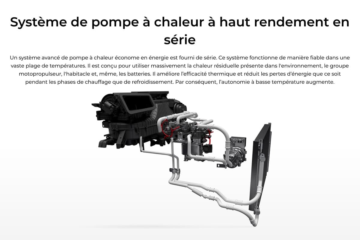Peugeot e-308 : sa pompe à chaleur est-elle vraiment efficace ?Différente d’un chauffage classique par résistance, la pompe à chaleur utilise les calories présentes dans l’environnement pour les restituer dans l’habitacle. Nous vous invitons à découvrir ou redécouvrir le fonctionnement d’une pompe à chaleur via cet article. Cependant, le système de BYD est présenté comme « un système intelligent » en cela qu’il promet d’utiliser la chaleur résiduelle de l’air dans le groupe motopropulseur (la fameuse unité 8 en 1), dans l’habitacle ou même dans la batterie. Selon la brochure, il permet d’augmenter l’autonomie en hiver. Un abus de langage puisqu’une pompe à chaleur, plus économe qu’un chauffage classique, permet de sauvegarder l’autonomie, mais en aucun cas de l’augmenter. Une nuance qui mériterait d’être homologuée par une norme spécifique, les pompes à chaleur échappant aujourd’hui aux mesures de la norme WLTP. Voyons désormais comment elle se comporte.