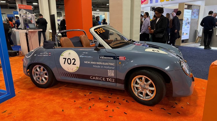 Présentée en 2023, la Carice TC2 a néanmoins fait le déplacement jusqu’à Las Vegas. Cachée sur le stand des Pays Bas dans l’Eureka Park, un hall entièrement dédié aux start-ups, elle veut concilier motorisation électrique et plaisir de conduite. Pour ce faire, ce petit roadster inspiré de la Porsche 356 Speedster avance un poids de 590 kg seulement et 56 ch grâce à son moteur électrique en position arrière. Ce dernier est animé par une batterie de 31,5 kWh qui promet jusqu’à 300 km d’autonomie.