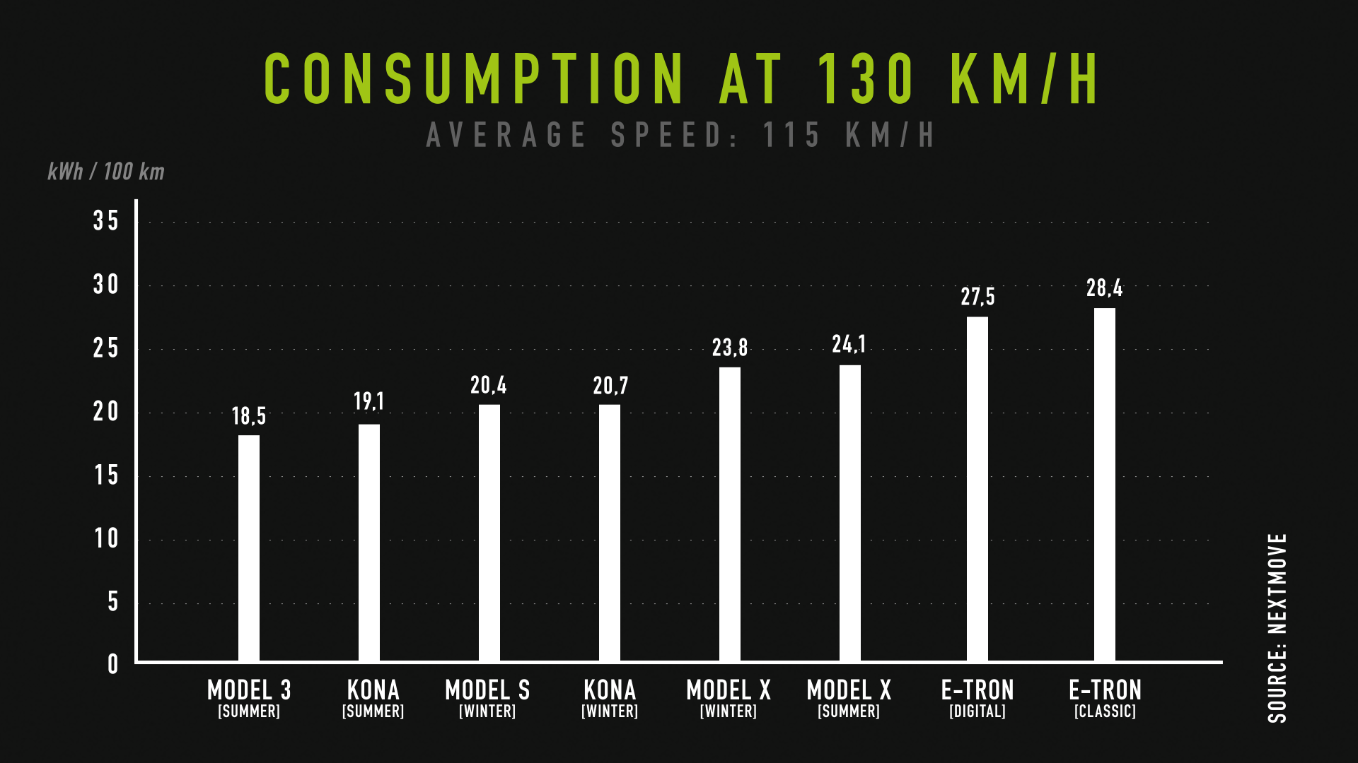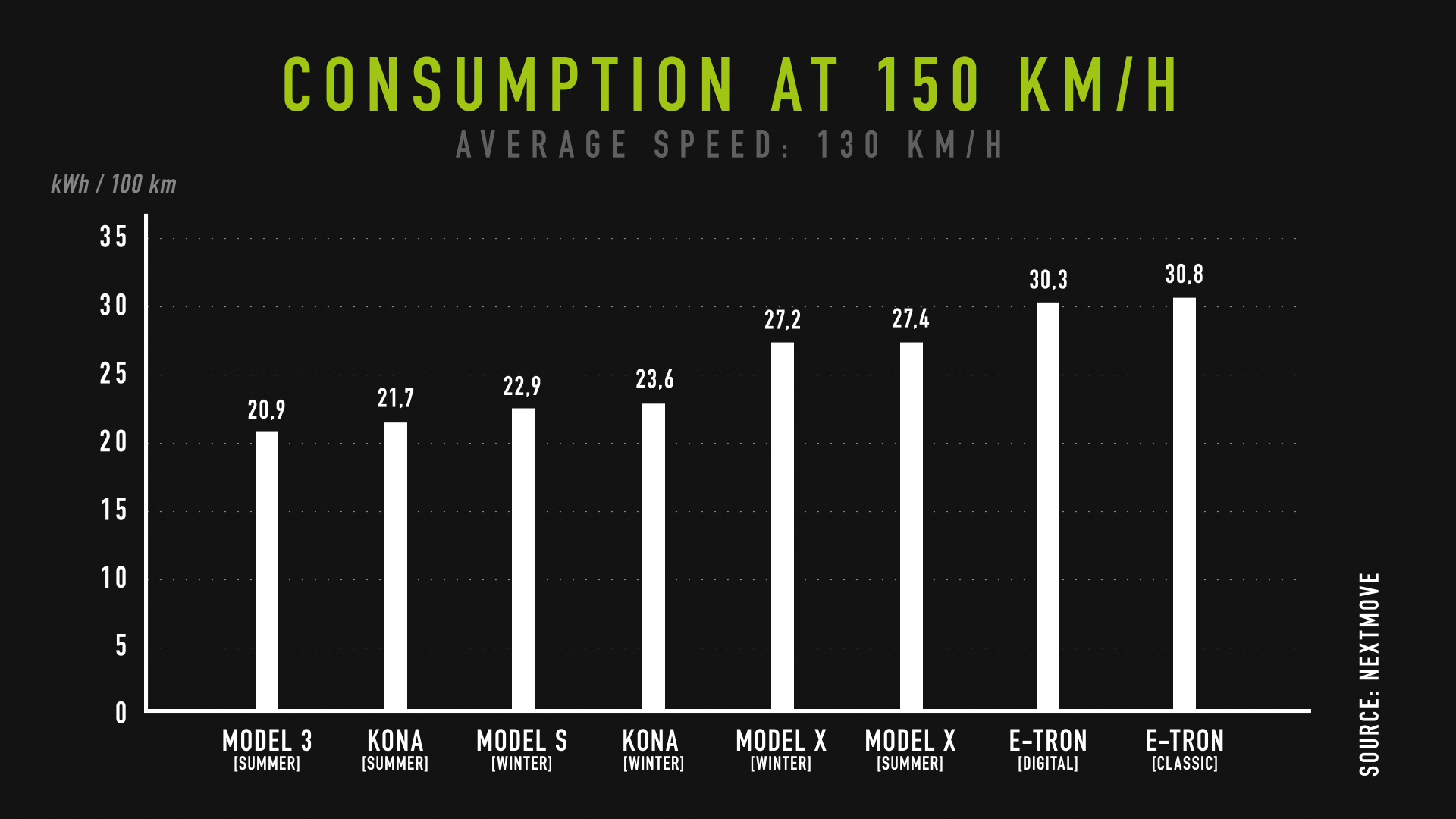 La palme revient cependant à la Tesla Model 3 sur le plan de la sobriété énergétique. La dernière-née du constructeur californien a affiché une consommation moyenne de 18,5 kWh/100 km, devant le Kona (19,1), la Model S (20,4), le Model X (23,8) et l’e-tron (27,5) lors du test à 130 km/h. Toujours devant sur l’essai à 150 km/h, la Model 3 n’a pas dépassé les 20,9 kWh/100 km, suivie du Kona (21,7), de la Model S (22,9), du Model X (27,2) et de l’e-tron (30,3). Les versions équipées de pneus hiver et de plus grandes jantes ont logiquement consommé davantage d’énergie.