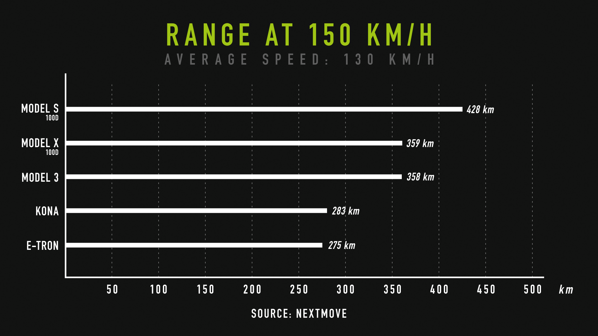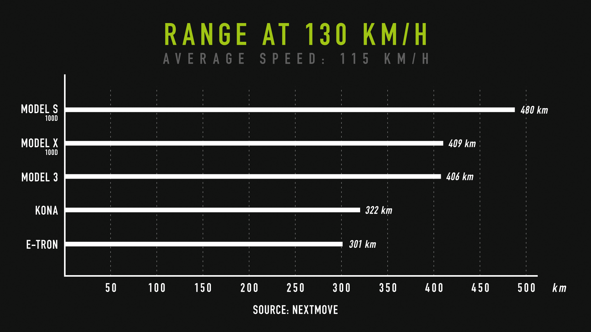Laquelle de ces huit voitures électriques est la plus performante à vitesse élevée ? Le loueur spécialisé Nextmove a effectué un test comparatif sur autoroute allemande avec une Tesla Model S100D, deux Model X100D avec jantes 19 et 20 pouces, un Model 3 Dual Motor (batterie de 75 kWh), deux Audi e-tron (95 kWh) avec et sans rétro-caméras et deux Hyundai Kona électriques (64 kWh) avec jantes 17 et 21 pouces. Le parcours totalisant 170 km a été réalisé à une vitesse de 130 km/h à l’aller et 150 km/h au retour, sans chauffage et par une température extérieure de 8 degrés.