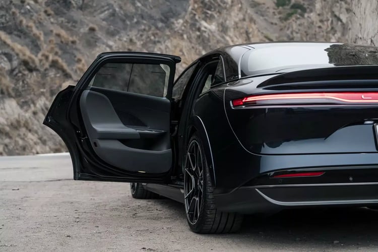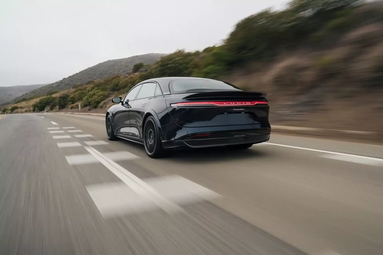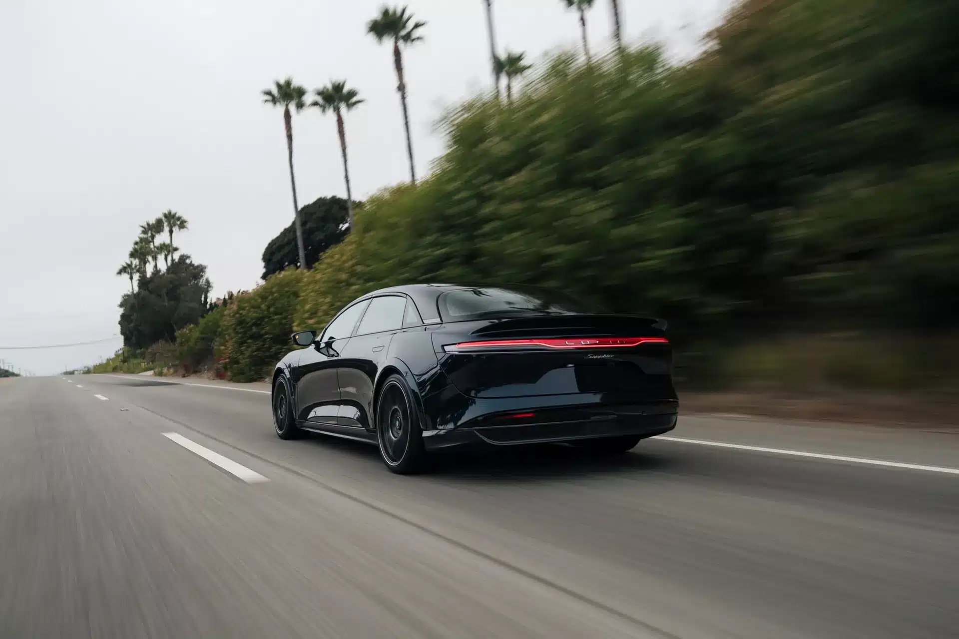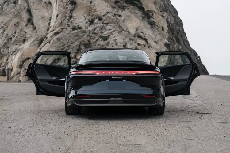 En effet, même dans cette configuration la Lucid Air Sapphire est capable d’atteindre une vitesse de pointe de 322 km/h (au lieu de 330 km/h dans sa version classique). Comme sur le modèle de série, le bolide est équipé d’un système de transmission intégrale à 3 moteurs capables d’offrir jusqu’à 1 234 ch.