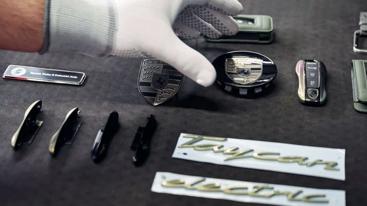 Pour la première fois de son histoire, Porsche a mélangé deux pigments ChromaFlair. Cette peinture permet à la Taycan de changer de couleur en fonction de la façon dont on la regarde. Elle est composée d’une couche centrale d’aluminium opaque et réfléchissante, entourée d’une couche ressemblant à du verre. Cette peinture dégradée ne se trouve pas seulement sur la carrosserie de la Taycan. On la retrouve aussi sur la désignation du modèle à l’arrière, sur le logo « Electric » et sur le couvercle du porte-clés créé spécialement pour cette édition Celestial Jade.
