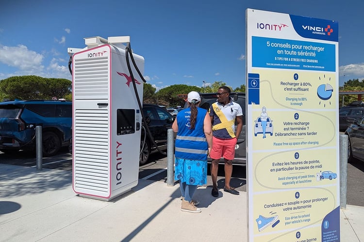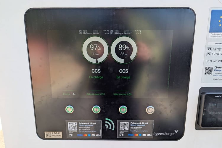 Reportage : quelle affluence craindre aux bornes de recharge sur l’autoroute en été ?Pour satisfaire ces derniers, c’est Ionity qui occupe le terrain sur les aires de Montélimar, où l’opérateur allemand enregistre sa plus grosse activité annuelle en France. Après deux premières stations, l’opérateur a décidé d’installer de nouvelles bornes sur les parkings. Désormais, les aires comptent chacune 24 points de recharge, soit un total de 48 prises. Outre les deux bornes tri standards de part et d’autre (CCS 50 kW, CHAdeMO, AC Type 2), on retrouve au total 12 bornes ABB 350 kW de première génération et 12 bornes ABB HP CP500C Gen 4 et 6 bornes Alpitronic. A noter que ces dernières proposent deux « pistolets », permettant donc de diviser par deux le nombre de bornes pour le même nombre de places. Cependant, si elle peuvent offrir un maximum de 400 kW aux rares voitures compatibles, la puissance est divisée par deux (200 kW max. par prise) lorsque deux voitures sont raccordées.