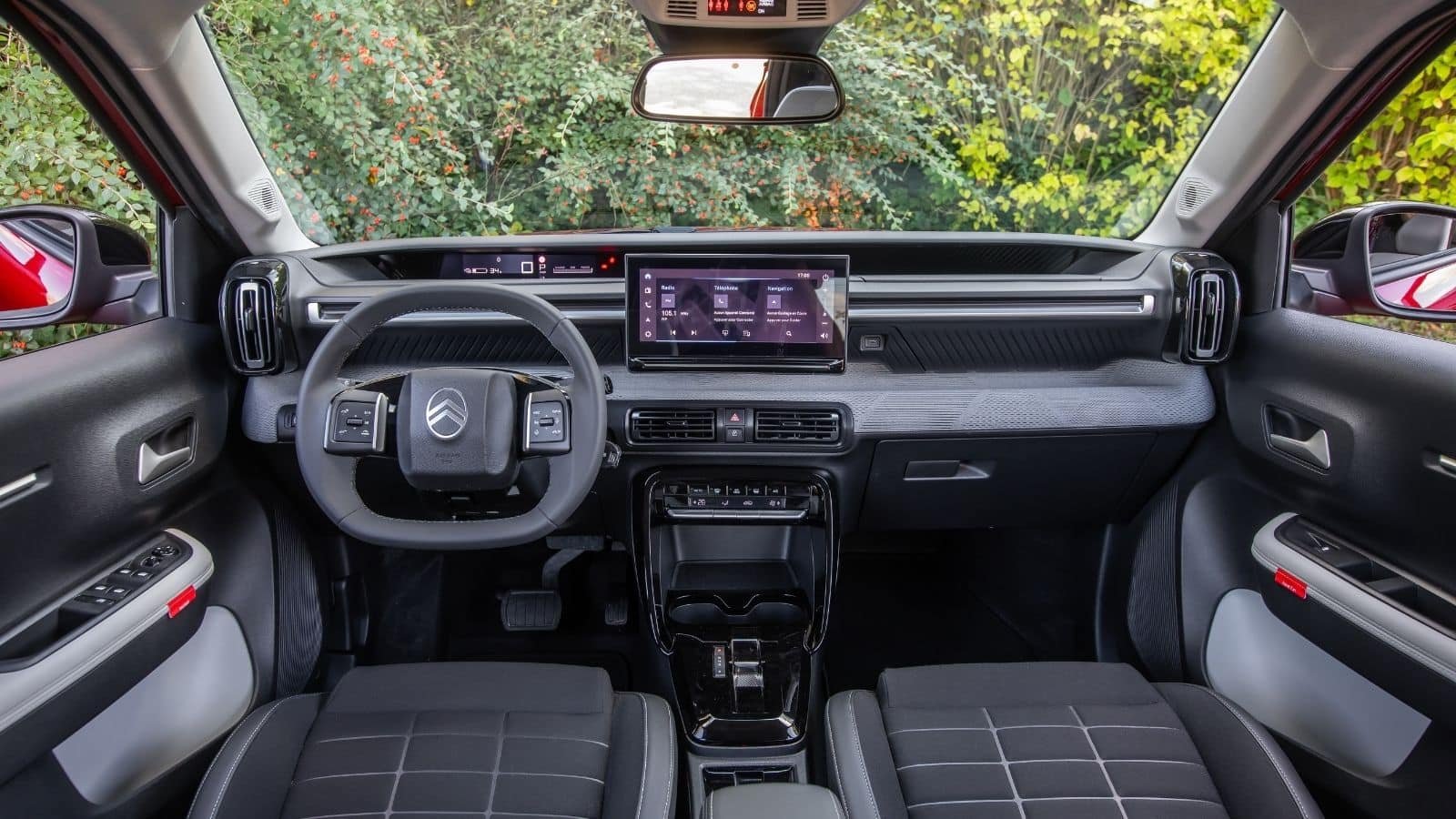 Avec la Citroën ë-C3, on pénètre dans un tout autre monde, avec du moelleux en sellerie, un accoudoir à l’avance réglable sans bruit de crécelle, une bonne présentation, des zones rembourrées, un chargeur à induction pour smartphone, deux porte-gobelet, de généreux bacs de contreportes, et des raccourcis physiques aussi sur les branches du volant. Pouvant aussi supporter Apple CarPlay et Android Auto, la dalle numérique n’offre que des possibilités limitées de réglages sanctionnés par des bips agaçants.
