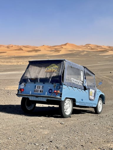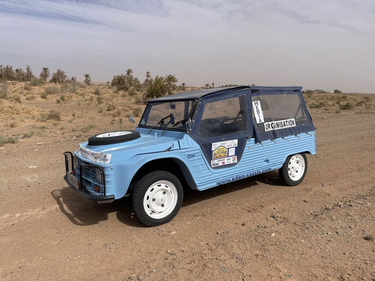 Rebaptisée « EDEN », la Méhari électrique du 2CV Méhari Club participait pour la première fois aux Gazelles. Hormis un toit solaire fourni par Provence Éco Energie, un spécialiste du photovoltaïque, la petite électrique n’a pas spécialement reçu d’adaptation pour son aventure au Maroc.