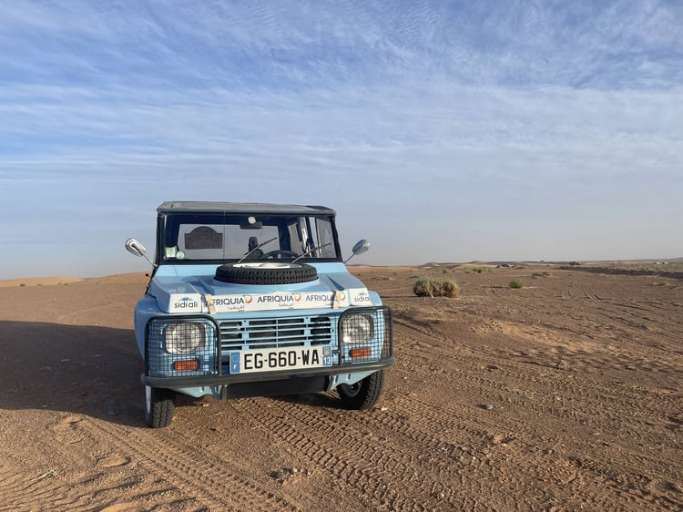 En matière d’autonomie, il ne faudra évidemment pas compter sur les 100 km annoncés par le constructeur. Avec sa petite batterie de 11 kWh, la Méhari électrique ne parcourra guère plus que 40 ou 60 km dans le désert marocain. « Tout va dépendre de la température. Lorsqu’il fait chaud, le sable est moins porteur et on s’enfonce beaucoup plus », nous explique Karolyn. « Le nombre de passagers a également une influence. Avec quatre personnes, les performances ne sont plus les mêmes », complète-t-elle.
