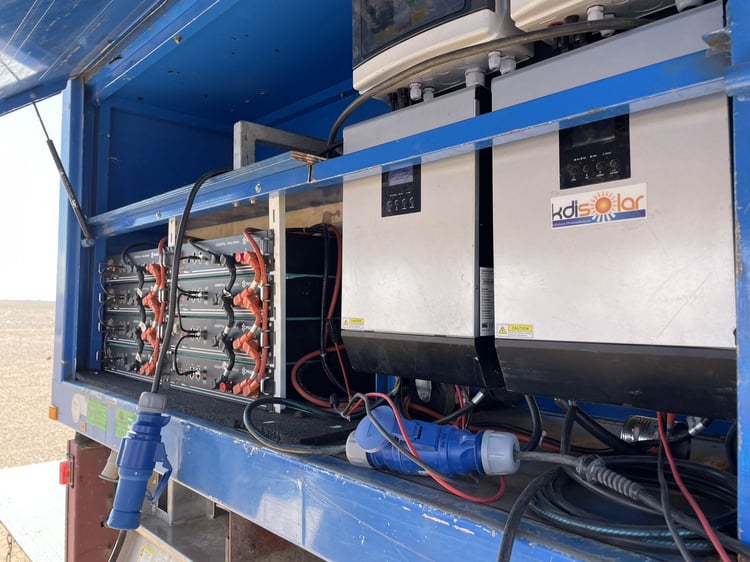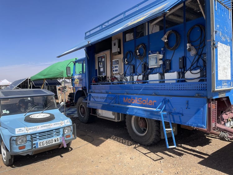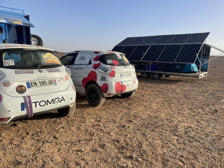 Avec un bivouac installé en plein désert et appelé à se déplacer à deux reprises au cours des dix jours de compétition, c’est le système D qui s’impose pour la recharge. Mis au point par Solutions VE, le dispositif a évolué au fil des ans.