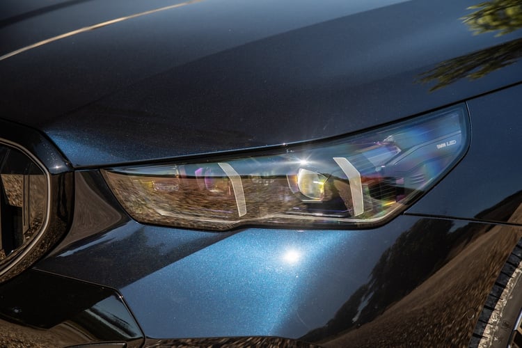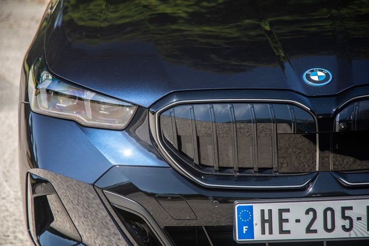 Notre BMW i5 Touring d’essai profite du Pack M Sport Pro facturé 1600 €, qui comprend des freins M rouges et les logos M. Elle ajoute des projecteurs LED adaptatifs, des vitres teintées, des projecteurs Shadow Line M, des poignées affleurantes, des jantes 20 pouces M (1300 €), un toit panoramique ouvrant à 1700 € et le pack extérieur Iconic Glow qui illumine la calandre et attire tous les regards la nuit. Mieux qu’un beau rouge à lèvres, mais aussi bien plus cher.
