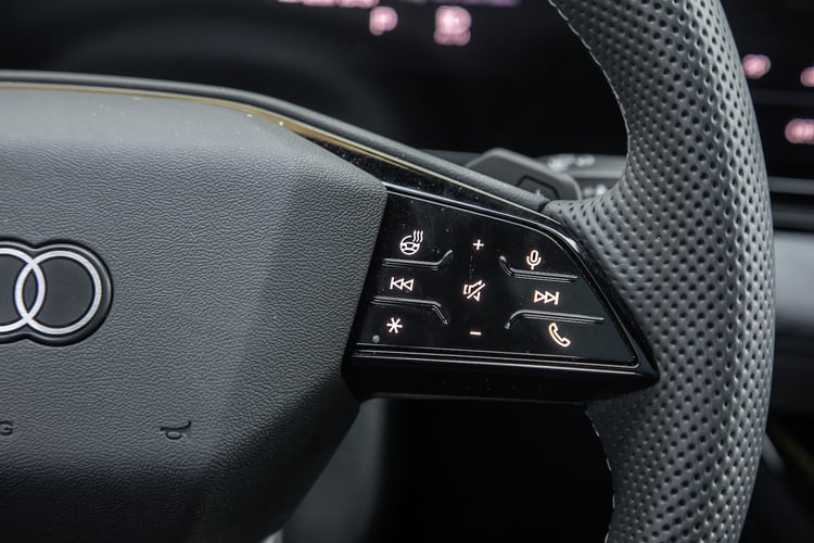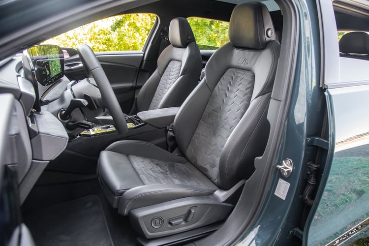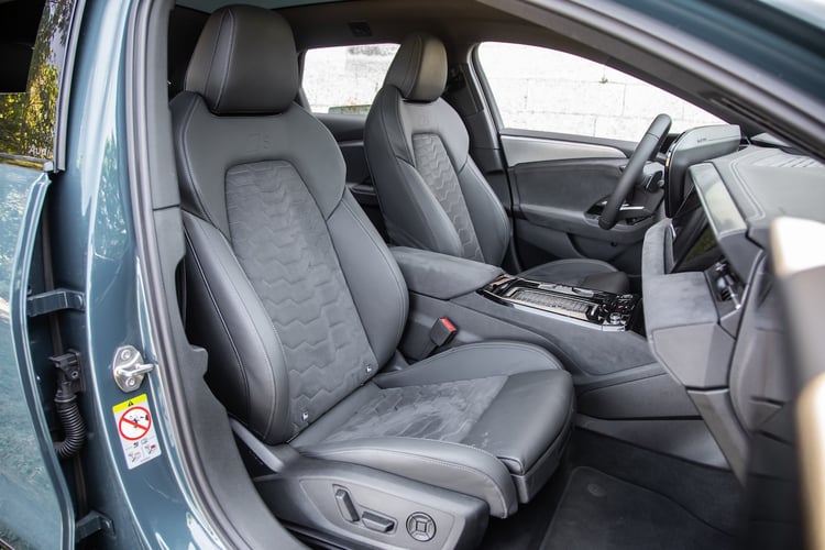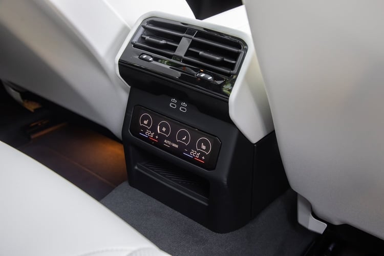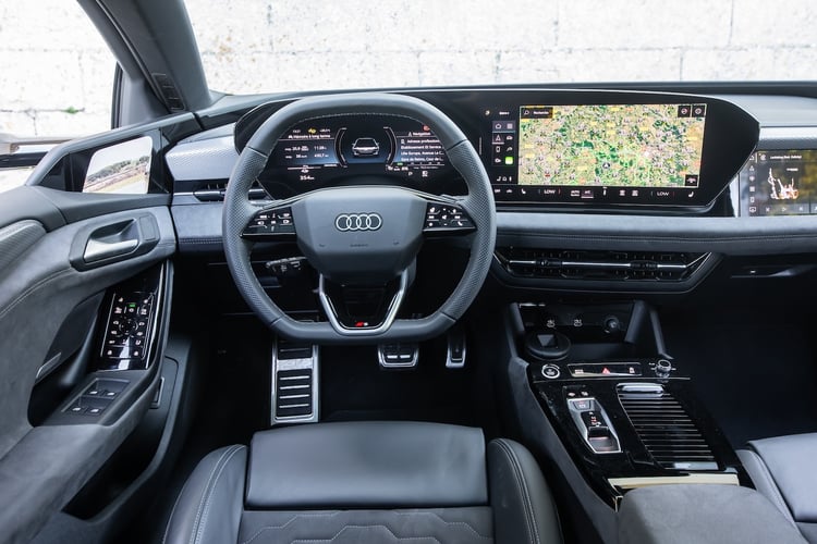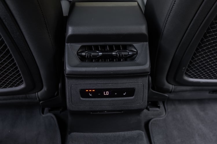 À l’avant, notre BMW bardée d’options intègre les sièges électriques à mémoire (1300 €), l’accès confort (1200 €) et le pack Confort (chauffage/ventilation + climatisation 4 zones), une sellerie Veganza ou Alcantara selon la version, un appui lombaire ajustable, et un volant multifonction. L’Audi s’équipe de beaux sièges sport électriques (Pack Intérieur S line à 1750 €), d’une sellerie Dinamica/cuir noir avec surpiqûres et de deux prises 60 W (Pack Expérience Pro).