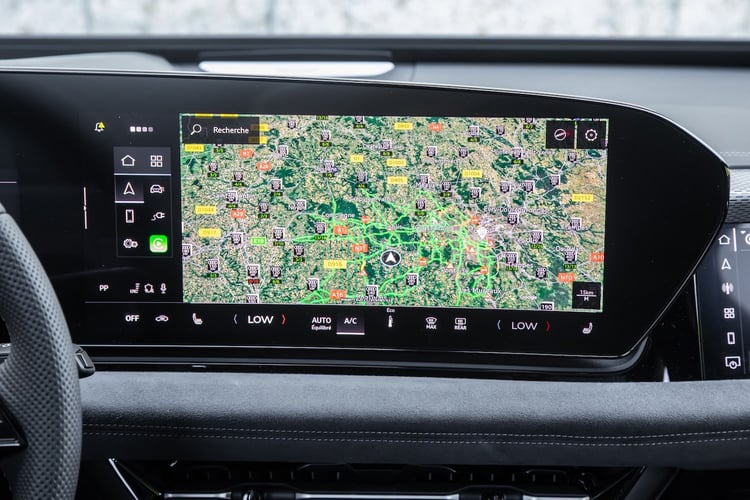 Le châssis de l’Audi A6 Avant en finition S line se révèle efficace dans le serré avec un excellent compromis entre confort et agilité. Mais un petit sentiment d’inertie se fait sentir par rapport à la BMW comme si la voiture était plus lourde et plus haute. Le poids est pourtant équivalent (2185 kg hors conducteur contre 2180 kg pour la BMW) malgré la présence d’une plus grosse batterie. Les suspensions métalliques apparaissent plus souples tandis que la pédale de frein et la direction se font plus douces, ce qui est agréable en ville mais moins pertinent en conduite dynamique. Notons qu’il est possible d’ajouter des suspensions pneumatiques adaptatives dans un pack Tech Pro à 3940 € (avec volant à réglage électrique, feux OLED, fermeture assistée) qui doivent sans doute améliorer les prestations en usage dynamique pour rivaliser avec la BMW.