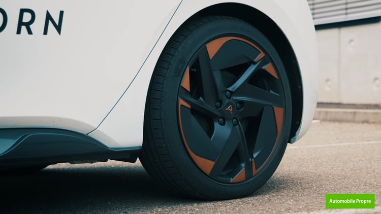 La Cupra Born affiche-t-elle un look sportif ? Max Freyss s’est posé cette question. Il a remarqué les jantes en alliage de 20 pouces traitées en noir et or rose. « Vingt pouces, ça fait sportif, et on a des pneus assez fins », apprécie-t-il. Cette impression est complétée par une garde au sol assez basse, un toit arrondi, et 2 choix artistiques.