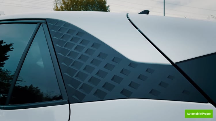Tout d’abord, de chaque côté, une pièce en plastique noir avec motifs. Prolongeant le vitrage, elle apporte de la fluidité. Ensuite, des bas de caisse gris ajoutent du dynamisme.