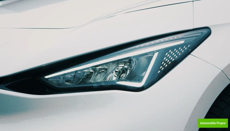 Cupra Born : la compacte électrique s’affiche à moins de 30 000 € en AllemagneSur la face avant, les blocs optiques apparaissent agressifs. « Ils donnent une forme assez énervée au véhicule », estime notre vidéaste. Le bouclier arrière à ailerons complète bien cette panoplie, ainsi que le bandeau lumineux racé. Max Freyss préfère au blanc Nevada (option à 640 euros) du modèle à notre disposition, le bleu Aurore (955 euros).