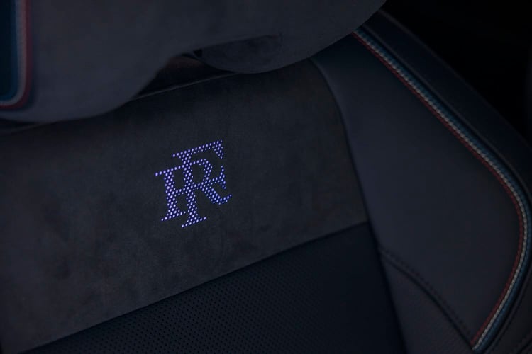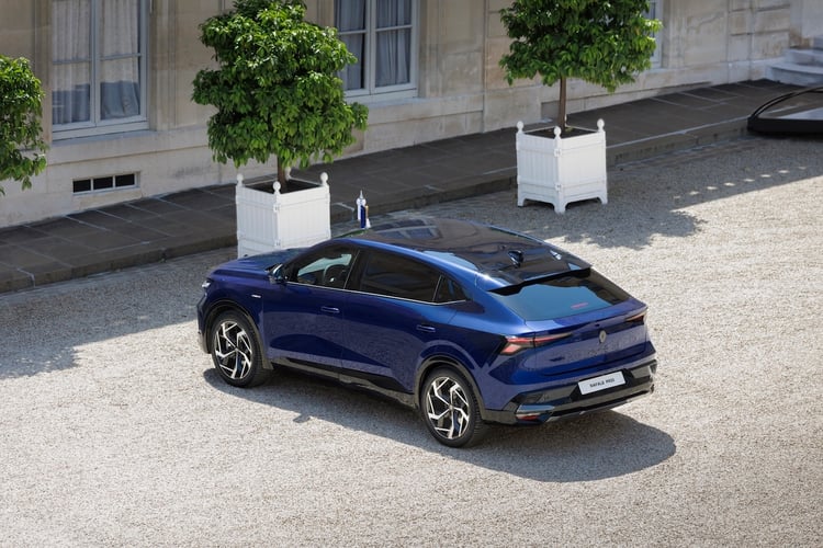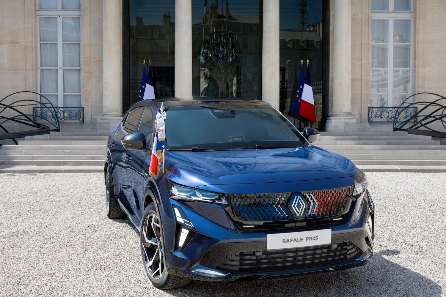Côté design, ce Rafale reçoit une teinte exclusive « Bleu Présidence ». Celle-ci intègre une technologie limitant l’absorption de chaleur jusqu’à 10 °C, contribuant ainsi au confort thermique de l’habitacle. Elle se distingue également par la présence de paillettes bleu, blanc et rouge, visibles en plein soleil. La calandre adopte un maillage en losange avec le drapeau tricolore. En bonne voiture présidentielle, cette Renault se dote de porte-fanions amovibles, discrètement intégrés à la carrosserie via des trappes escamotables, et d’éclairages spécifiques.