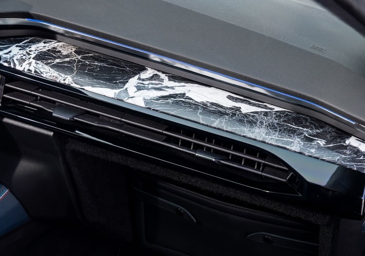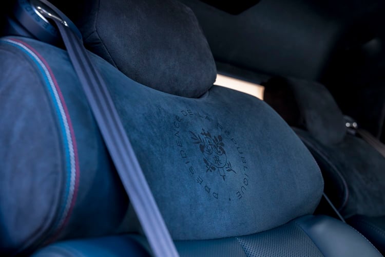 A bord, on trouve des habillages en marbre noir et en bois de hêtre foncé. La sellerie est associée à des surpiqûres tricolores. es appui-têtes ont été gravés au laser pour y apposer les armoiries françaises (une pelta, un faisceau de licteur et des branches de chêne et d’olivier).