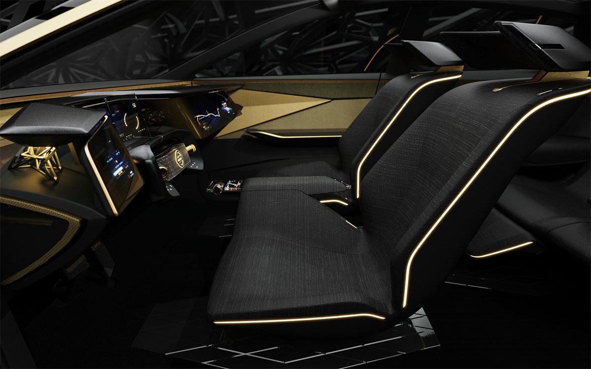 L’intérieur est sans aucun doute la partie la plus surprenante avec une atmosphère bercée de lumière et concentrée autour d’une ambiance noire et or. Le mobilier se limite à 3 sièges individuels en tissu dont un central arrière aux larges accoudoirs, la planche de bord étant soutenue par des motifs géométriques japonais « asanoha » et recouverte d’une vague surplombant les trois écrans faisant face au conducteur.