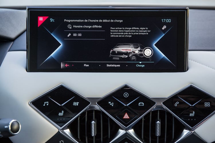 A l’intérieur, la philosophie est la même et cette version électrique ne diffère que très peu de ses cousines thermiques. Hormis le « E » intégré au sélecteur de vitesse, la DS 3 électrique se distingue par des éléments spécifiques sur tout la partie numérique. Trônant au centre de la planche de bord, l’écran tactile offre ainsi des menus électriques dédiés. Accessible via un bouton symbolisé par un éclair intégré au tableau de bord, ceux-ci sont au nombre de trois. Le premier propose à l’utilisateur de suivre les flux d’énergie, le second de consulter son historique de consommations et le troisième d’organiser la programmation de la charge.