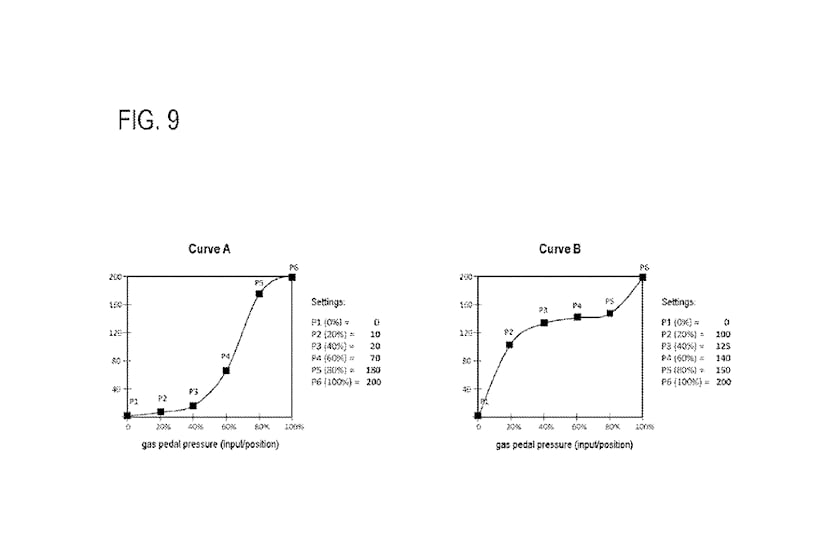 Le fonctionnement du système se base sur deux graphiques : une courbe de vitesse et une courbe d’accélération. Les deux sont directement liés à la position de la pédale d’accélérateur. Comme les véhicules électriques reposent principalement sur des transmissions à entraînement direct à un seul rapport, vous pouvez régler une vitesse en fonction de la position de la pédale d’accélérateur – ou d’ailleurs de l’impulsion d’un contrôleur de type joystick, comme le prévoit aussi le brevet. Vous pouvez choisir parmi des préréglages une carte linéaire, progressive ou exponentielle et adapter une vitesse exacte à une certaine sollicitation de la pédale de droite. Ainsi, à 10% d’utilisation de l’accélérateur, vous pouvez toujours rouler à 30 km/h, tandis qu’à 50% d’accélérateur, la voiture se déplacera à une vitesse exacte de 130 km/h (ou toute autre vitesse que vous avez sélectionnée).