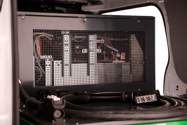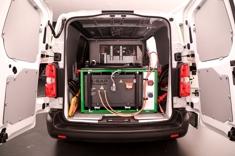 Pour finir, petit tour du côté de deux autres produits et services. Premièrement, le camion de recharge mobile E-Gap Fast Delivery. Nous avons pu découvrir de près l’un de ces camions contenant 850 kg de batteries. À l’intérieur, pas moins de 6 000 cellules pour 130 kWh en nominal (100 à 110 kWh réels). Il est possible de choisir entre 22 kW (AC) et jusqu’à 90 kW (DC). Commandé depuis l’application mobile, le camion vient vous recharger sur place et à votre convenance. Le client particulier peut demander 20, 30, 40, 50 kWh… et un temps de charge. Le premier critère atteint (temps de charge ou quantité) stoppe la recharge. Bonus : une prise annexe permet de proposer des services supplémentaires. E-Gap peut ainsi proposer, en option, un passage d’aspiration, un contrôle des pneumatiques, etc, pendant la recharge. Un vrai plus pour les flottes d’entreprises.
