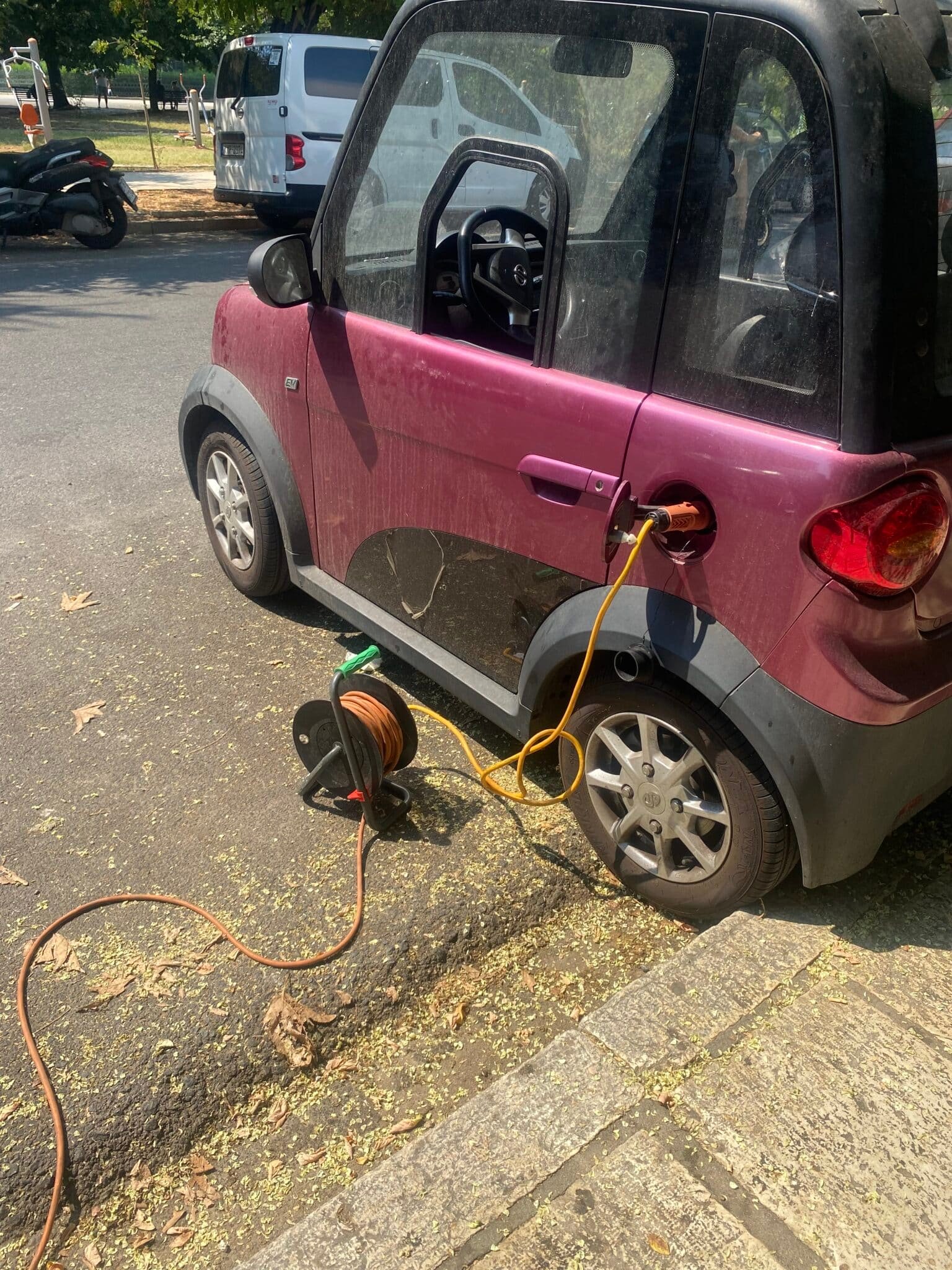 Par ailleurs, dans la ville de Corfou, j’ai croisé des véhicules électriques sans permis, arborant une immatriculation particulière, « eco-car ». Cette plaque leur accorde probablement un accès privilégié à certaines zones du centre-ville, interdites aux autres véhicules. Ces petites voitures sont des « City Fun » de la marque japonaise Jiayuan by ASPP. C’est d’ailleurs la première fois que j’ai vu un véhicule électrique en état de recharge, mais sur un réseau électrique domestique.