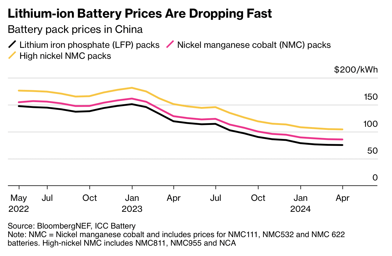 Selon un récent rapport de Bloomberg, nous sommes peut-être à un tournant majeur dans l’histoire de la voiture. Plus besoin de faire de modélisations pour savoir quand le prix des batteries baissera suffisamment pour décarboner le transport routier, « ce jour est arrivé », écrit le média américain. Les cellules de batteries lithium-fer-phosphate (LFP) se vendent désormais à 53 dollars par kWh contre 95 dollars par kWh en 2023.