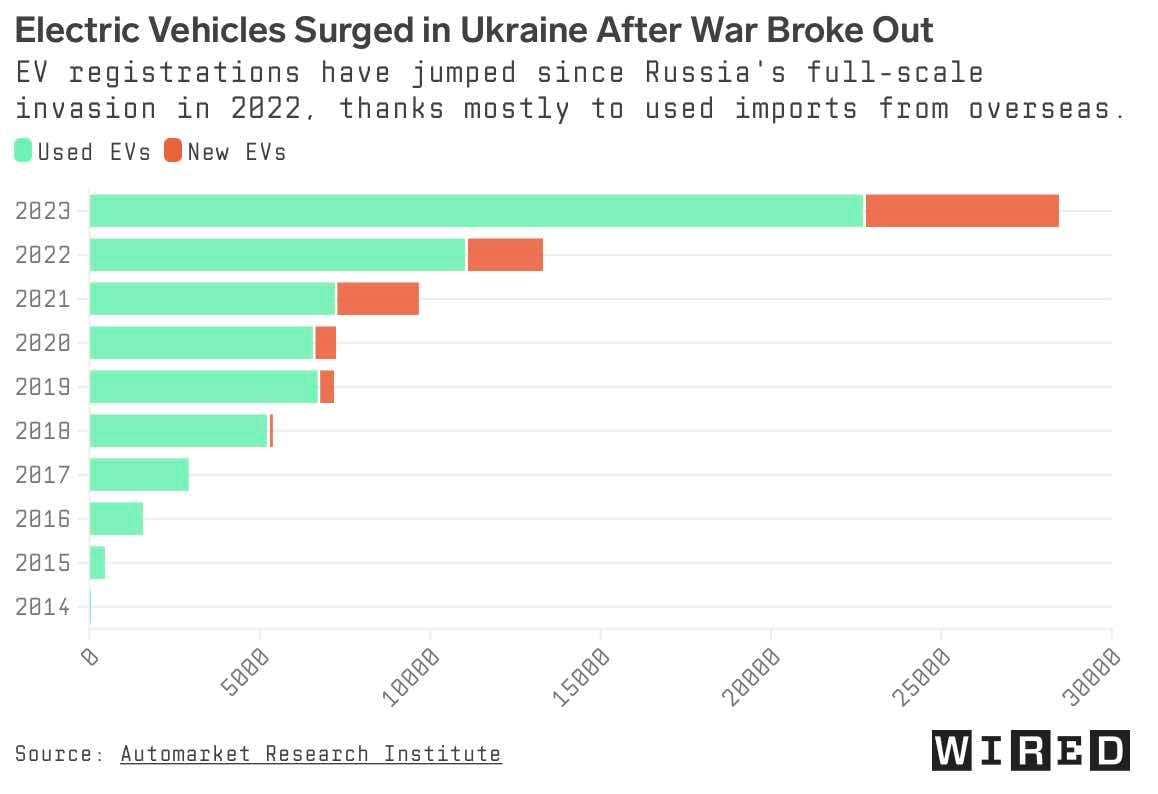Ukraine : Tesla ouvre ses superchargeurs pour aider les réfugiésComme on peut le voir sur ce graphique réalisé par Wired avec les données de l’Automarket Research Institute, le nombre de voitures électriques a quasiment été multiplié par trois entre 2021 et 2023. On constate également que la part des modèles d’occasion est bien plus importante que celle des modèles neufs. La guerre en Ukraine a donc réellement stimulé cette croissance. Dans le pays, « la Tesla est même devenue une voiture populaire pour le commun des mortels », selon Ivan Malakhovsky. Son entretien est très bon marché.