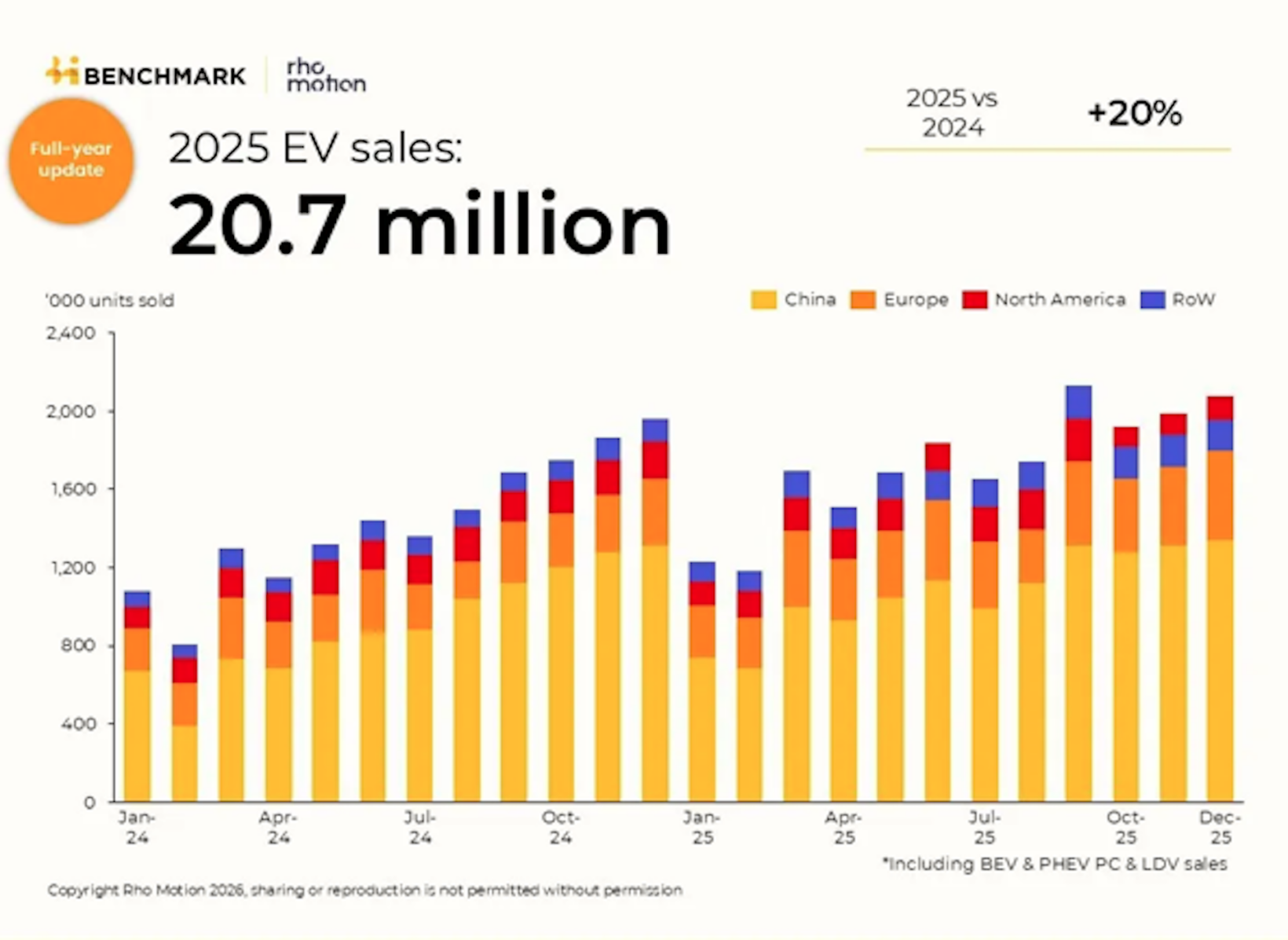 Les résultats 2025 confirment une nouvelle fois la tendance de ces dernières années. Les ventes de voitures électrifiées (les modèles 100 % électriques et hybrides rechargeables confondus) ont nettement progressé à l’échelle de la planète. Selon les données compilées par le cabinet Rho Motion et partagées par Electrek, 20,7 millions d’automobiles de ce type ont été livrées l’an dernier, soit 3,6 millions de plus qu’en 2024. En volume comme en rythme de croissance, la dynamique s’est renforcée par rapport aux années précédentes.